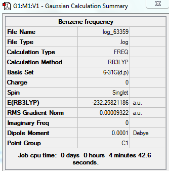 Item Value Threshold Converged? Maximum Force 0.000204 0.000450 YES RMS Force 0.000084 0.000300 YES Maximum Displacement 0.000870 0.001800 YES RMS Displacement 0.000313 0.001200 YES Predicted change in Energy=-4.983462D-07 Optimization completed. -- Stationary point found. ---------------------------- ! Optimized Parameters ! ! (Angstroms and Degrees) ! -------------------------- -------------------------- ! Name Definition Value Derivative Info. ! -------------------------------------------------------------------------------- ! R1 R(1,2) 1.3963 -DE/DX = 0.0001 ! ! R2 R(1,6) 1.3961 -DE/DX = 0.0002 ! ! R3 R(1,7) 1.0861 -DE/DX = 0.0002 ! ! R4 R(2,3) 1.3961 -DE/DX = 0.0002 ! ! R5 R(2,8) 1.0861 -DE/DX = 0.0002 ! ! R6 R(3,4) 1.3963 -DE/DX = 0.0001 ! ! R7 R(3,9) 1.0861 -DE/DX = 0.0002 ! ! R8 R(4,5) 1.3961 -DE/DX = 0.0002 ! ! R9 R(4,10) 1.0861 -DE/DX = 0.0002 ! ! R10 R(5,6) 1.3963 -DE/DX = 0.0001 ! ! R11 R(5,11) 1.0861 -DE/DX = 0.0002 ! ! R12 R(6,12) 1.0861 -DE/DX = 0.0002 ! ! A1 A(2,1,6) 119.9996 -DE/DX = 0.0 ! ! A2 A(2,1,7) 119.9968 -DE/DX = 0.0 ! ! A3 A(6,1,7) 120.0036 -DE/DX = 0.0 ! ! A4 A(1,2,3) 120.0036 -DE/DX = 0.0 ! ! A5 A(1,2,8) 119.9916 -DE/DX = 0.0 ! ! A6 A(3,2,8) 120.0048 -DE/DX = 0.0 ! ! A7 A(2,3,4) 119.9967 -DE/DX = 0.0 ! ! A8 A(2,3,9) 120.0101 -DE/DX = 0.0 ! ! A9 A(4,3,9) 119.9932 -DE/DX = 0.0 ! ! A10 A(3,4,5) 119.9996 -DE/DX = 0.0 ! ! A11 A(3,4,10) 119.9891 -DE/DX = 0.0 ! ! A12 A(5,4,10) 120.0113 -DE/DX = 0.0 ! ! A13 A(4,5,6) 120.004 -DE/DX = 0.0 ! ! A14 A(4,5,11) 120.0048 -DE/DX = 0.0 ! ! A15 A(6,5,11) 119.9912 -DE/DX = 0.0 ! ! A16 A(1,6,5) 119.9965 -DE/DX = 0.0 ! ! A17 A(1,6,12) 120.0072 -DE/DX = 0.0 ! ! A18 A(5,6,12) 119.9963 -DE/DX = 0.0 ! ! D1 D(6,1,2,3) -0.0059 -DE/DX = 0.0 ! ! D2 D(6,1,2,8) 180.0021 -DE/DX = 0.0 ! ! D3 D(7,1,2,3) -180.0099 -DE/DX = 0.0 ! ! D4 D(7,1,2,8) -0.0019 -DE/DX = 0.0 ! ! D5 D(2,1,6,5) -0.0055 -DE/DX = 0.0 ! ! D6 D(2,1,6,12) -179.9972 -DE/DX = 0.0 ! ! D7 D(7,1,6,5) -180.0016 -DE/DX = 0.0 ! ! D8 D(7,1,6,12) 0.0068 -DE/DX = 0.0 ! ! D9 D(1,2,3,4) 0.0119 -DE/DX = 0.0 ! ! D10 D(1,2,3,9) 180.0087 -DE/DX = 0.0 ! ! D11 D(8,2,3,4) 180.0039 -DE/DX = 0.0 ! ! D12 D(8,2,3,9) 0.0007 -DE/DX = 0.0 ! ! D13 D(2,3,4,5) -0.0064 -DE/DX = 0.0 ! ! D14 D(2,3,4,10) -180.0058 -DE/DX = 0.0 ! ! D15 D(9,3,4,5) 179.9968 -DE/DX = 0.0 ! ! D16 D(9,3,4,10) -0.0026 -DE/DX = 0.0 ! ! D17 D(3,4,5,6) -0.005 -DE/DX = 0.0 ! ! D18 D(3,4,5,11) 180.0061 -DE/DX = 0.0 ! ! D19 D(10,4,5,6) -180.0057 -DE/DX = 0.0 ! ! D20 D(10,4,5,11) 0.0055 -DE/DX = 0.0 ! ! D21 D(4,5,6,1) 0.011 -DE/DX = 0.0 ! ! D22 D(4,5,6,12) 180.0027 -DE/DX = 0.0 ! ! D23 D(11,5,6,1) 179.9999 -DE/DX = 0.0 ! ! D24 D(11,5,6,12) -0.0085 -DE/DX = 0.0 ! -------------------------------------------------------------------------------- GradGradGradGradGradGradGradGradGradGradGradGradGradGradGradGradG