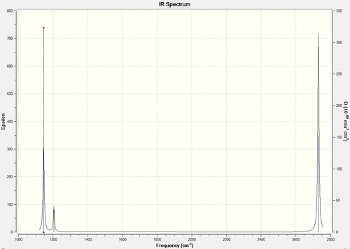 When comparing the IR spectrum to the IR table, it can be seen that the number of peaks do not correspond. This is due to one of the IR values originating from a symmetrical stretch, therefore making it IR inactive, and due to there being two pairs of degenerate vibrational frequencies.