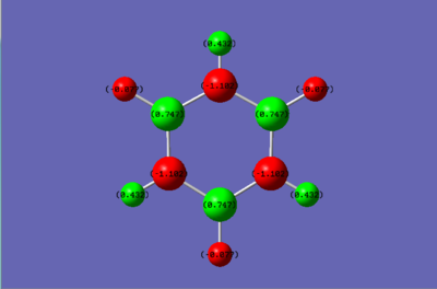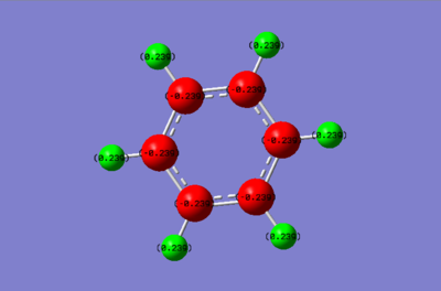 Looking at the charge distribution of benzene, all the charges of the Carbons are identical as well as those of the Hydrogens. Carbon is slightly more electronegative than hydrogen which is why it has the negative charge. The Borazine molecule on the other hand has electronegative nitrogen atoms and electropositive boron atoms. This explains the negative charge of Nitrogen, the positive charge of Boron and the complementary charges of the H atoms.