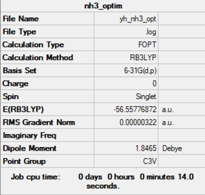 This page contains some general information on optimising BH3, NH3, NH3BH3, NI3 and two more complex cations. It lists the basis set, summary, item table and frequency data for each substance, and the data were obtained as proceeding through the optimisation steps. For the two cations, the descriptions are more theoretically based and the usefulness on LCAO approach in Inorganic Molecular Orbital Chemistry is strengthened.