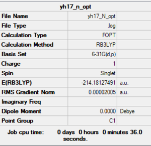 Item Value Threshold Converged? Maximum Force 0.000075 0.000450 YES RMS Force 0.000017 0.000300 YES Maximum Displacement 0.001657 0.001800 YES RMS Displacement 0.000429 0.001200 YES